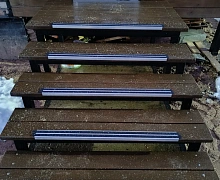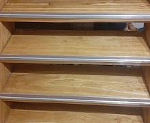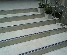 Способ монтажа: алюминиевый порожек без вставки крепится на ступени при помощи саморезов. Затем прорезиненную ПВХ вставку нужно нагреть строительным или обычным феном, либо подержать в горячей воде, чтобы материал стал мягче и легче вошел в паз профиля.